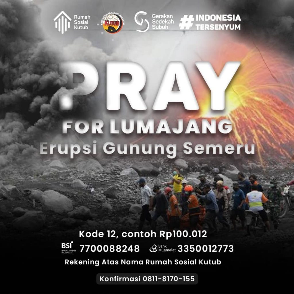 Rumah Sosial Kutub membuka donasi kepada seluruh elemen masyarakat yang ingin meringankan korban yang terdampak erupsi dari Gunung Semeru. Penggalangan donasi ini langsung dibuka beberapa saat setelah kejadian yang menyebabkan duka bagi kita semua. Duka bagi Indonesia.